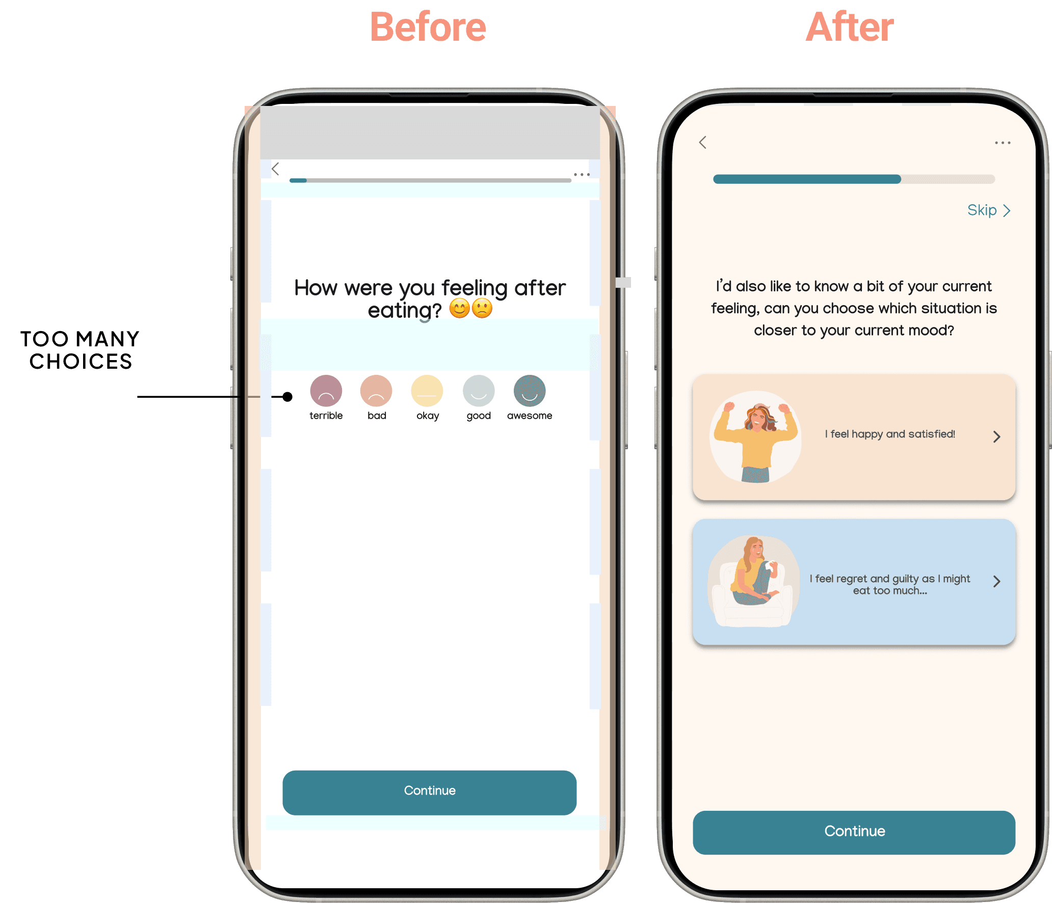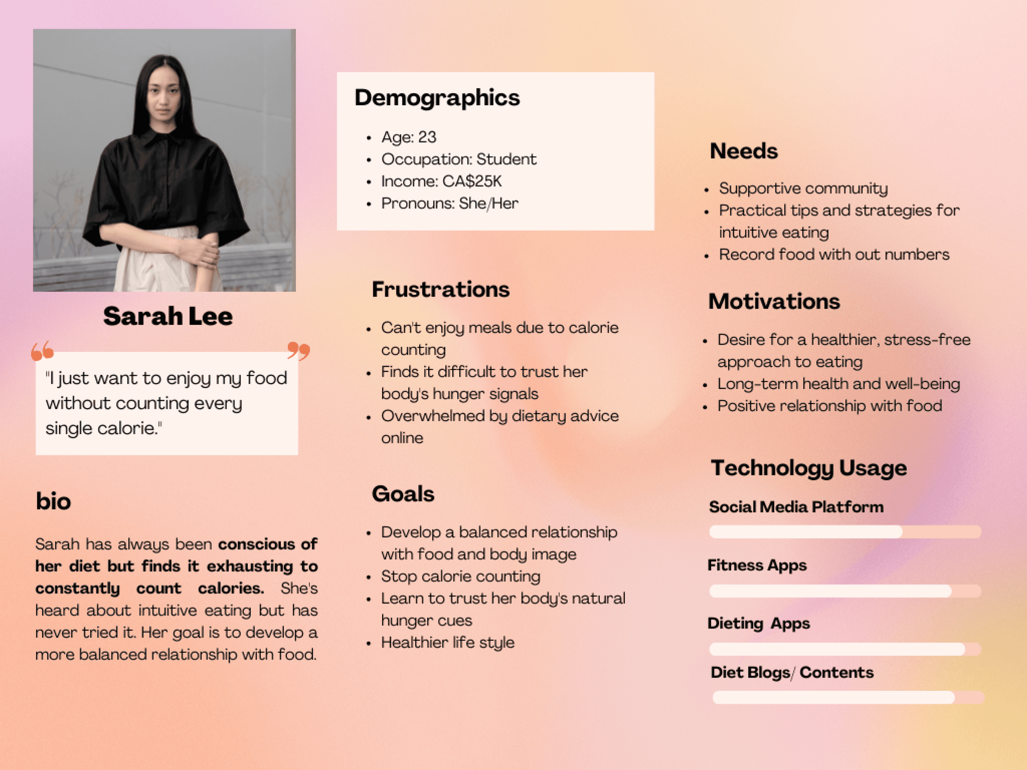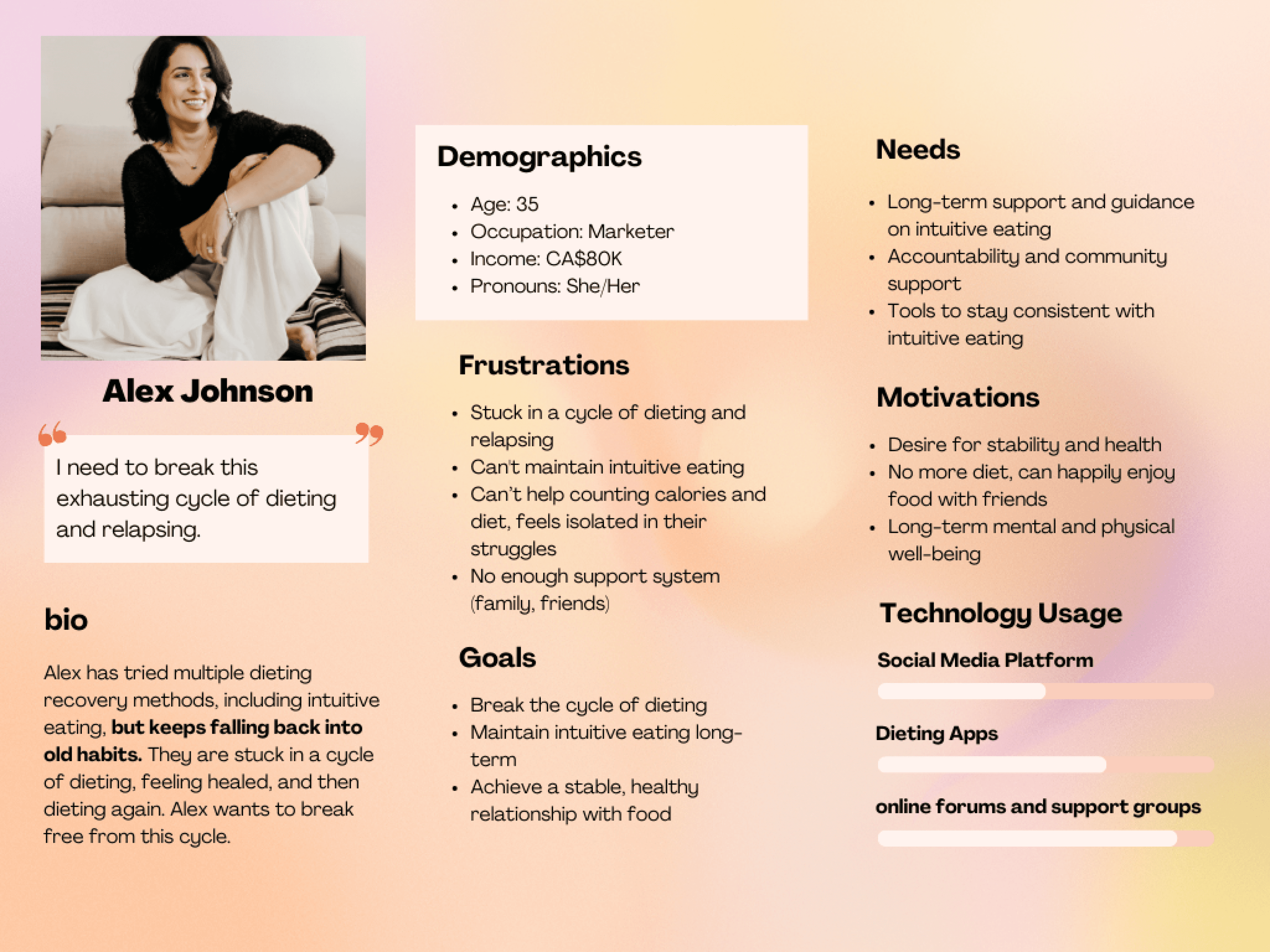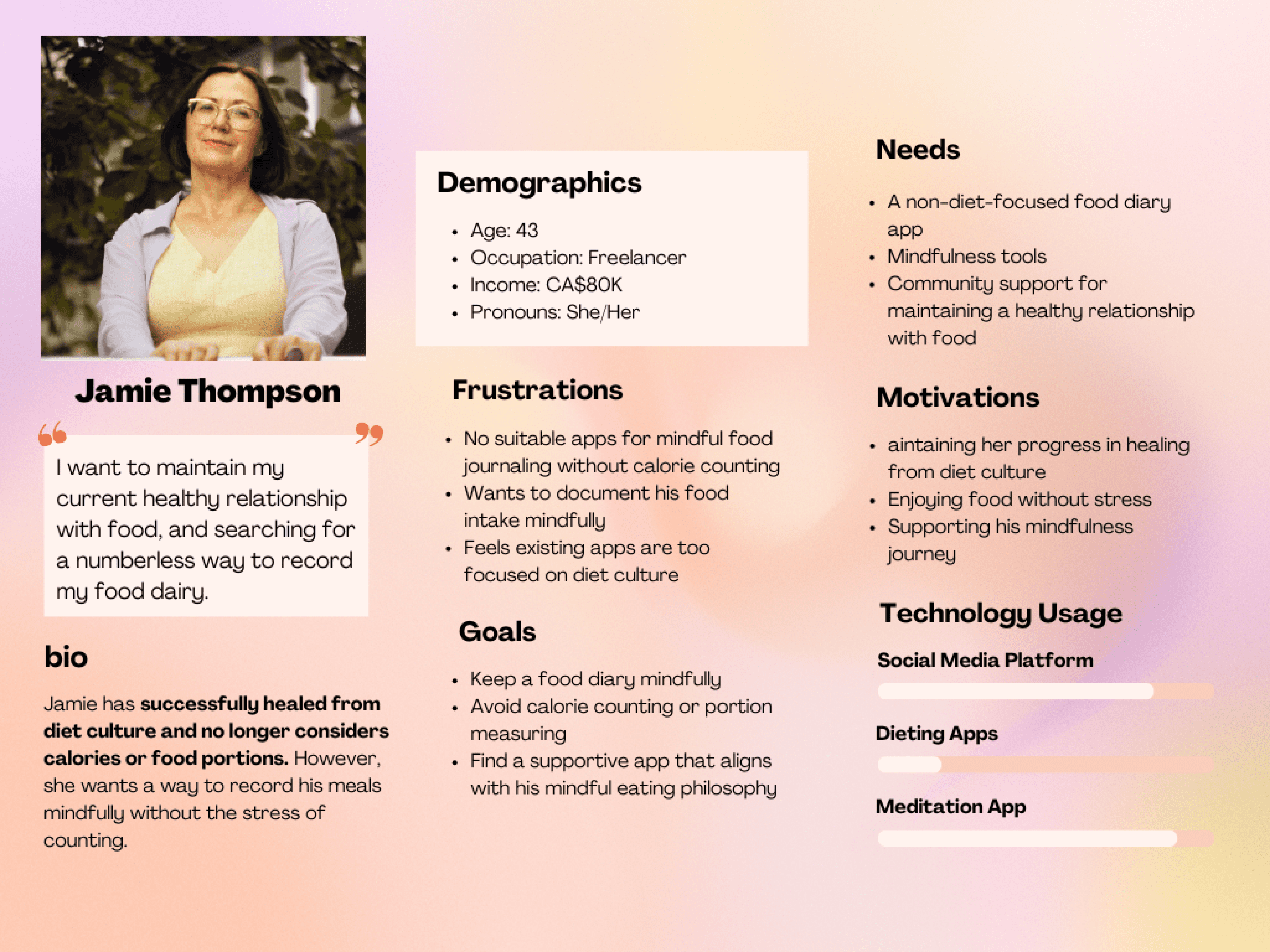 Many of my users are looking to break free from diet culture and heal from their obsession with calorie counting, seeking relief from the frustration associated with calories and body weight. However, most current apps focus primarily on weight control and calorie tracking. They need a product that supports their journey toward healing from diet culture.